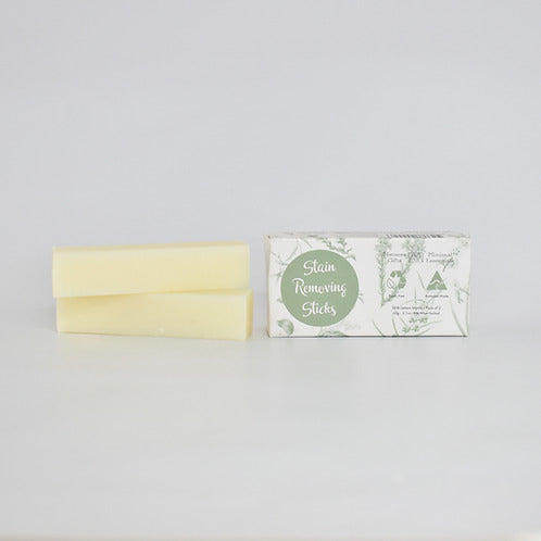 A natural stain remover stick is a solid soap bar made with plant based ingredients that helps remove stains from clothing before washing.